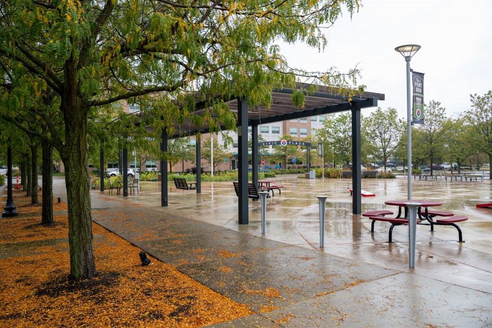 Located in the heart of Fort Ben at Otis Avenue and Wheeler Road, Lawrence Civic Plaza has become a vibrant gathering space for the community since its $1.5 million renovation in 2022. The Plaza now features a variety of amenities, including a wind tree that generates power for plaza outlets, outdoor seating, bike racks, a community grill, and games like dominos and cornhole.