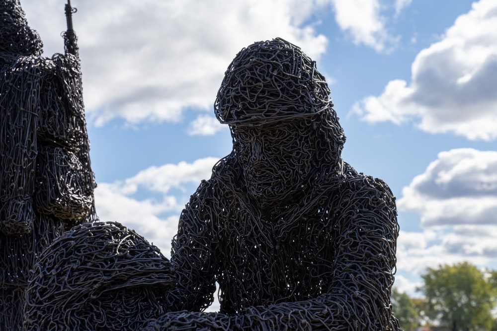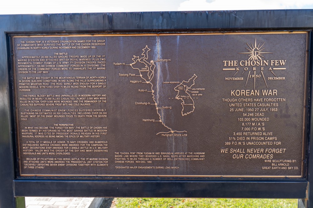 Created in 1994, this life-sized wire sculpture captures both the hardship and heroism of those who fought in the freezing winter of 1950, where U.S. forces endured impossible conditions and fought their way to safety against overwhelming odds.