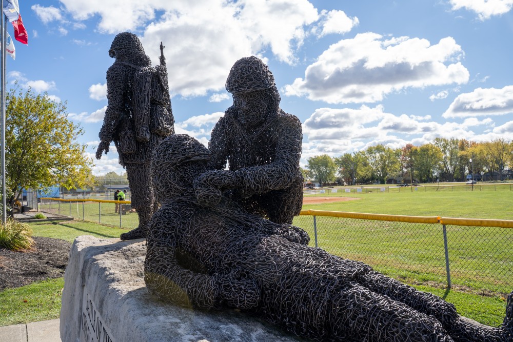 Located at Veterans Memorial Park (12150 E. 62nd St.), the Battle of the Chosin Reservoir by Indiana artist William E. Arnold depicts three soldiers—one injured, one assisting, and one standing watch.