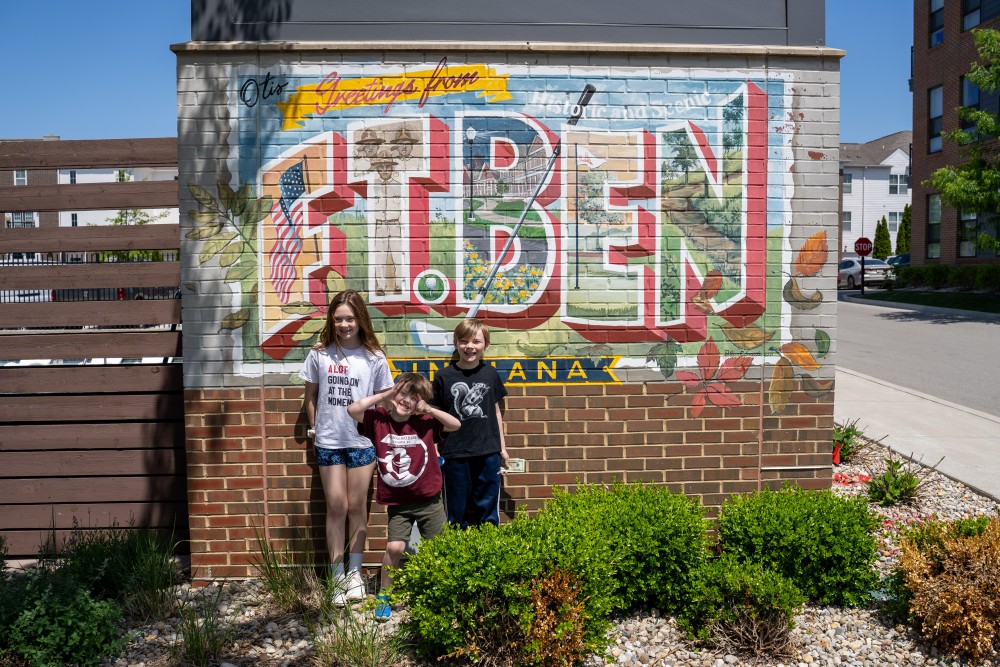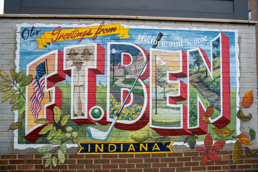 Designed in the style of a vintage large-letter postcard, each bold letter features a piece of the neighborhood’s story — from the American flag and three saluting soldiers to Historic Lawton Loop, the Fort Ben Golf Course, and the trails of Fort Harrison State Park.